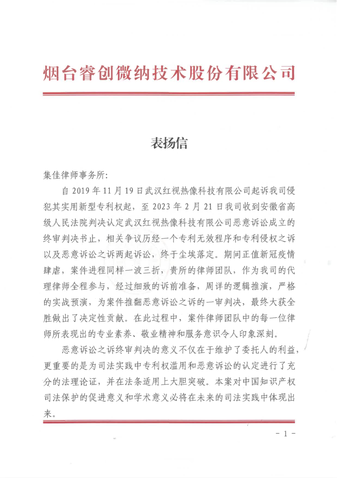 2023年2月10日,安徽省高级人民法院就烟台睿创微纳技术股份有限公司、烟台艾睿光电科技有限公司、安徽英睿系统技术有限公司等(下称“睿创集团”)与武汉红视热像科技有限公司(下称“武汉红视”)因恶意提起知识产权诉讼损害责任纠纷一案作出终审判决,认定武汉红视滥用诉权的行为构成恶意诉讼,并判令其赔偿睿创集团相应的合理支出。至此,时隔四年,横跨疫情时代的专利侵权及恶意诉讼系列纠纷案,终于尘埃落定。江南体育协助睿创集团最终取得系列案件的全面胜利,维护了客户合法权益,实现了商业竞争的公平正义!