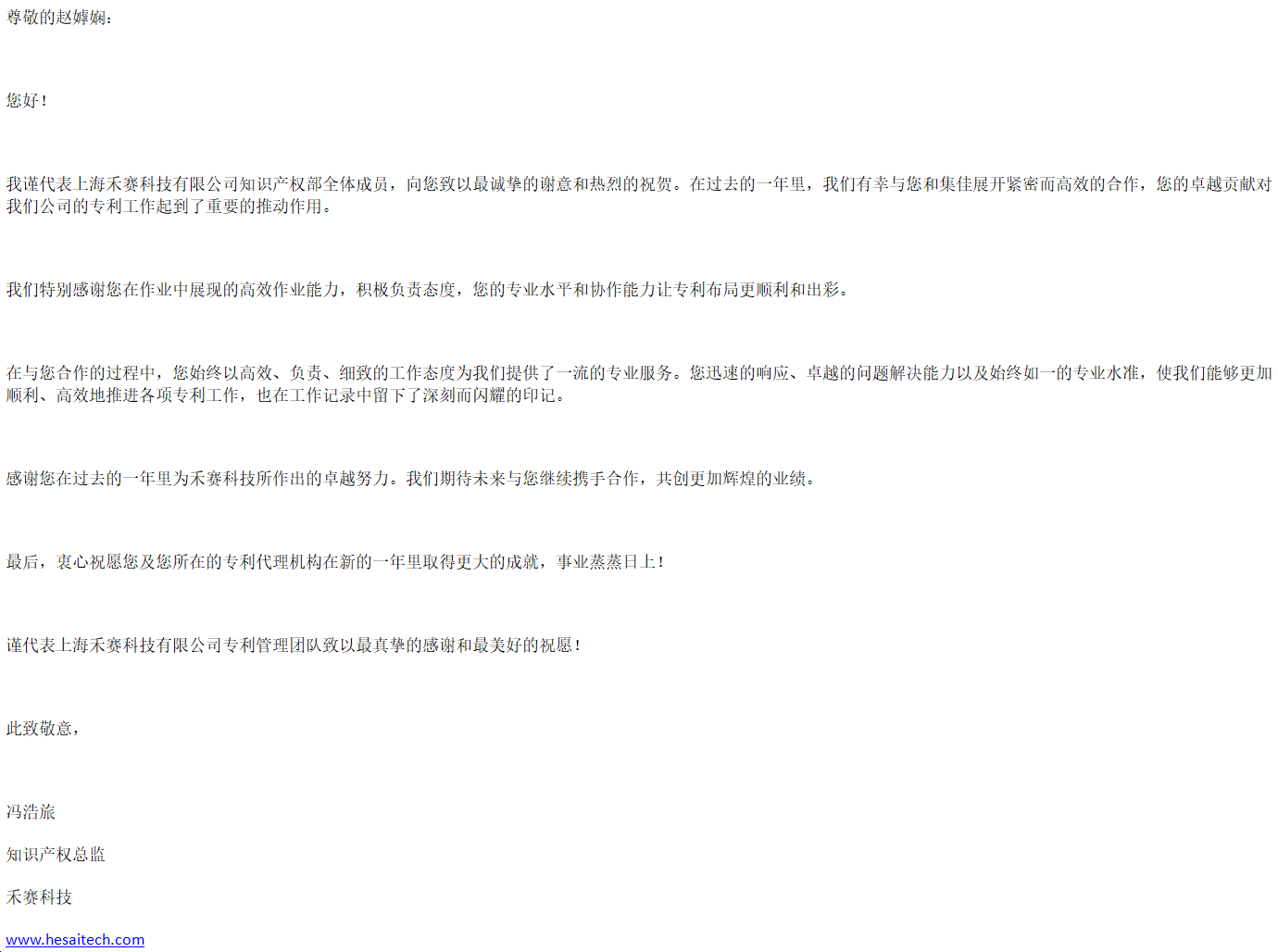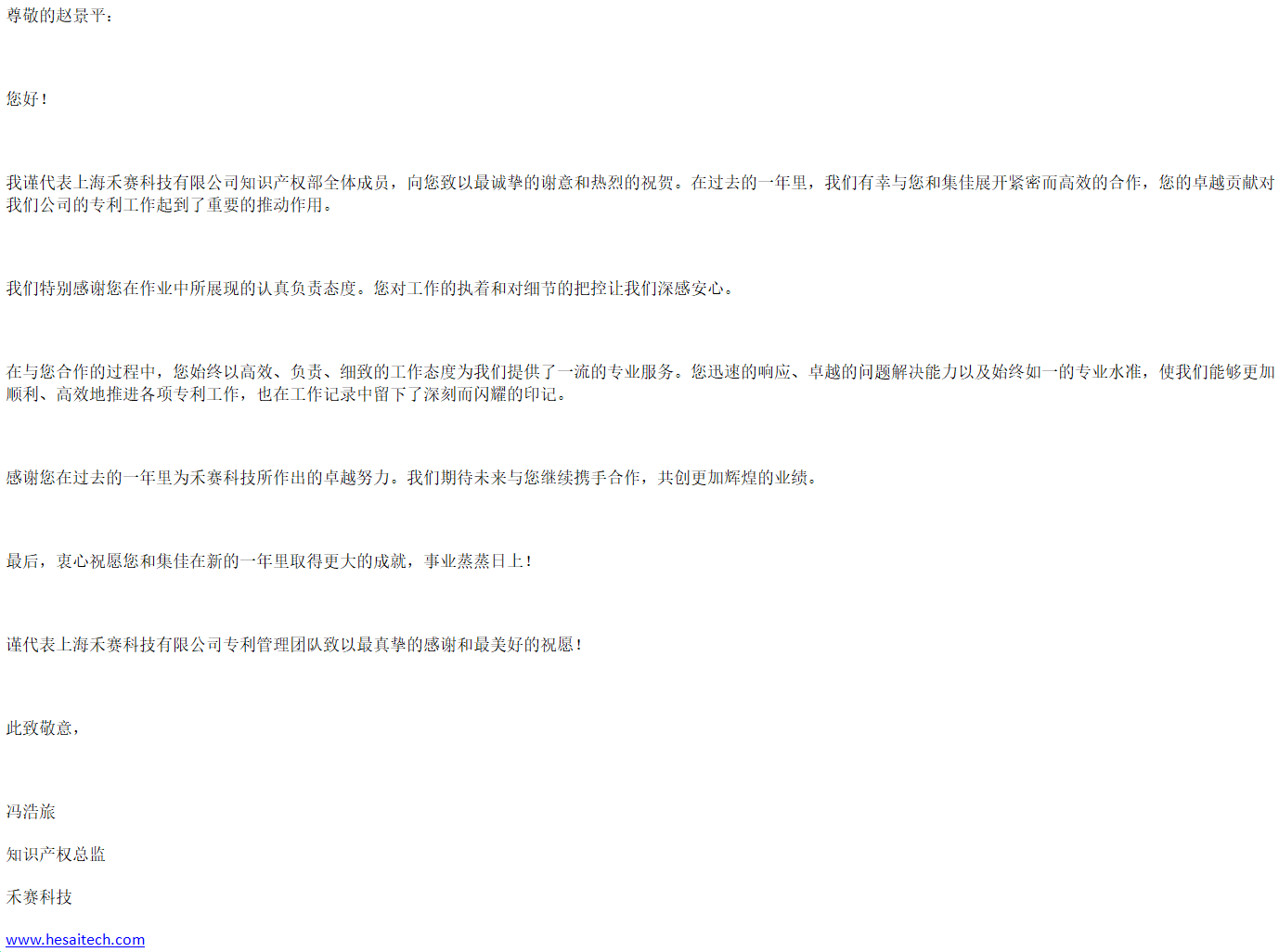 新年伊始,集佳喜获来自客户上海禾赛科技有限公司的感谢信,对江南体育上海分所提供的优质服务表示感谢。