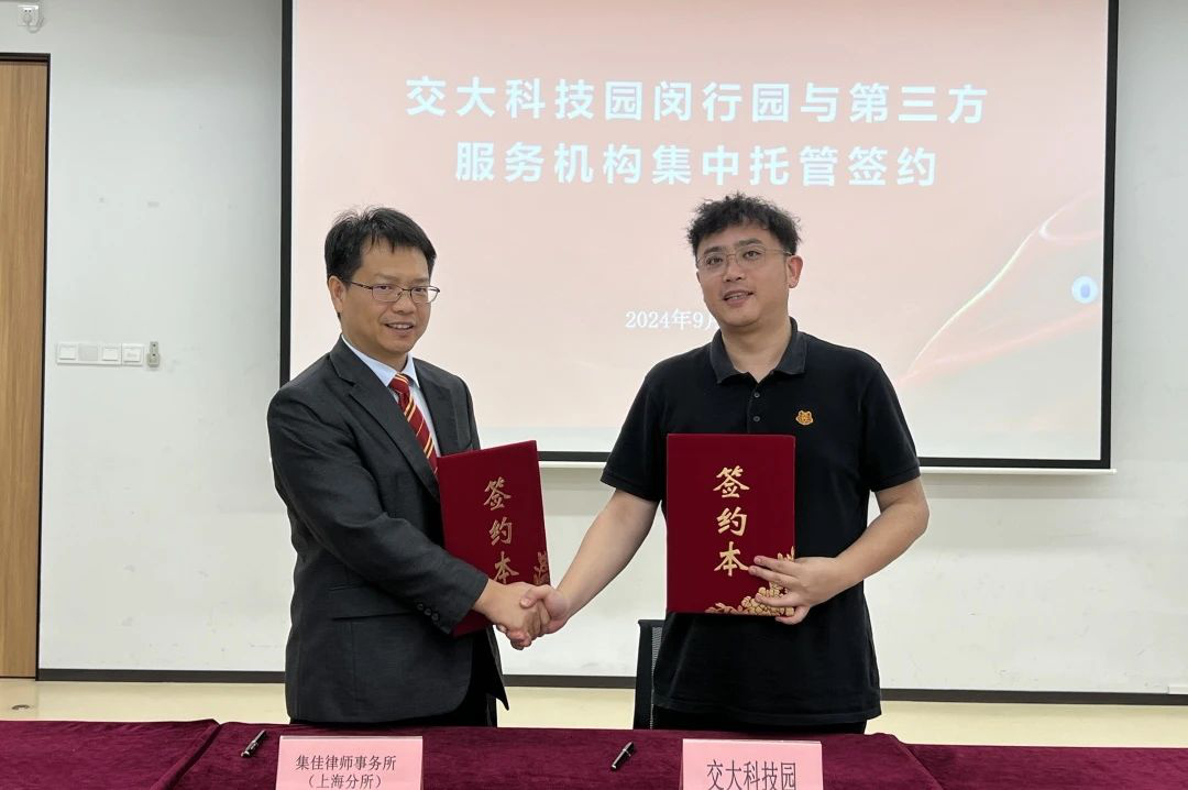 为助力企业科技创新和经济发展护航保障,提供高质量维权公益援助,会上举行了“上海市开发区协会维权援助工作站交大科技园闵行园工作室”揭牌仪式,交大科技园闵行园与江南体育上海分所进行了托管签约。