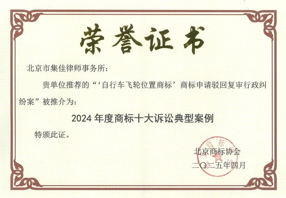 >江南体育>关于我们>荣誉概览>2025>集佳代理“自行车飞轮位置商标”行政纠纷案入选北京商标协会年度十大诉讼典型案例